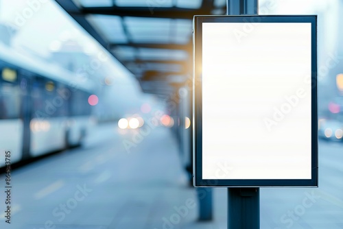 Blank advertising billboard at a bus stop with city traffic in the background, perfect for adding your own advertisement or message.