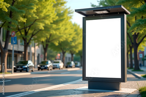 Blank Advertising Billboard on City Street with Lush Green Trees