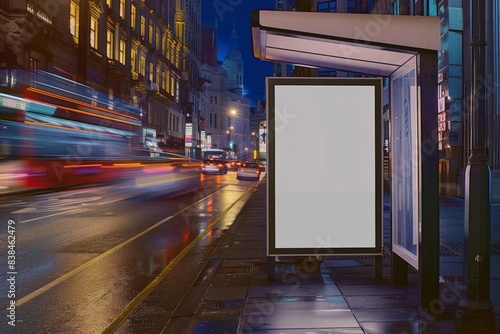 Blank advertising light box on bus stop, mockup of empty ad billboard on night bus station, template banner on background city street for text, afisha board and headlights of cars.