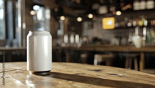 Blank aluminum can on a rustic wooden table in a busy bar. Blurry background showcases interior with warm lighting and various elements