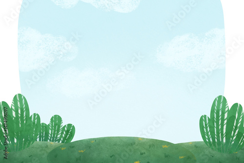 Blank background of blue sky with clouds, green meadow and bushes, digital handmade illustration. An element for the design
