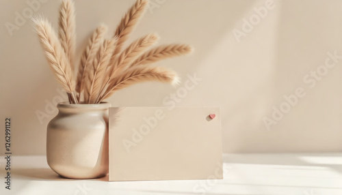 Blank beige card with small red heart near ceramic vase with dried pampas grass. Perfect for designers to showcase text for sustainable themes, invitations or eco-friendly stationery concepts