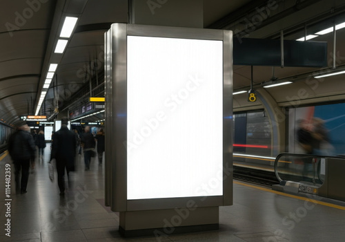 Blank billboard advertising panel in subway station with blurred people walking