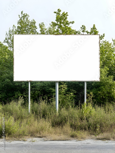 Blank Billboard amidst lush foliage, roadside, ideal for advertising, promotion.