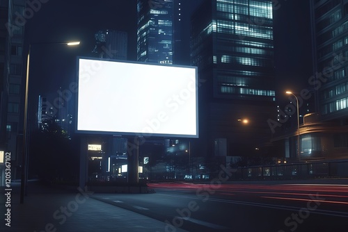 Blank billboard at night in a city with modern buildings