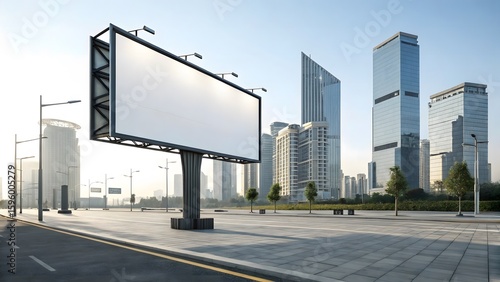 Blank Billboard, Expansive blank billboard on a city street with modern skyscrapers under a clear sky
