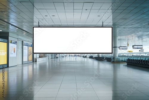 Blank Billboard in Airport Terminal, Wide Shot, Horizontal Composition, Airport Interior, Transportation, Advertisement, Design