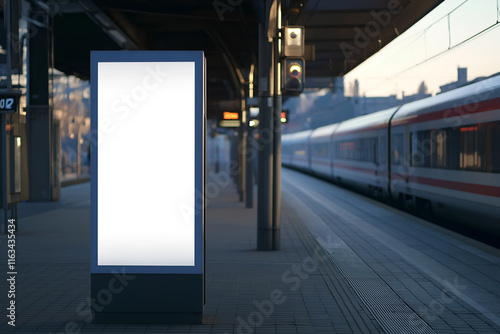 Blank billboard mock up on a train station platform with trains nearby. Promotion information for marketing announcements and details