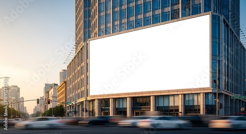 Blank Billboard Mockup on Modern Skyscraper in Urban Setting with Motion Blurred City Traffic at Golden Hour