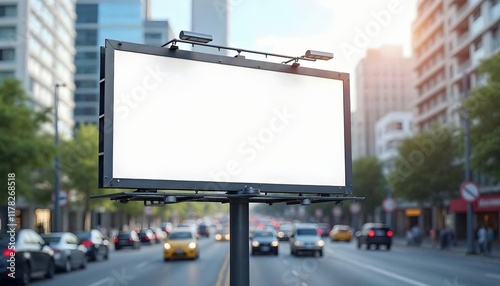 Blank billboard on a city street with traffic in the background. Billboard mockup.