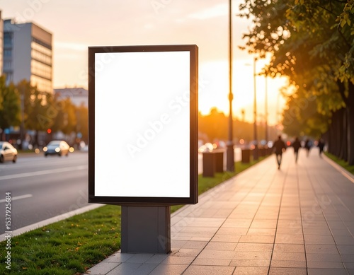 Blank Billboard on City Sidewalk at Sunset with Pedestrians and Traffic
