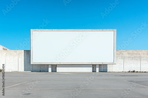 Blank billboard on concrete wall in empty parking lot under blue sky.