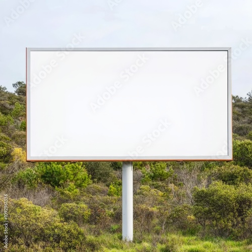 Blank billboard on roadside with vegetation.