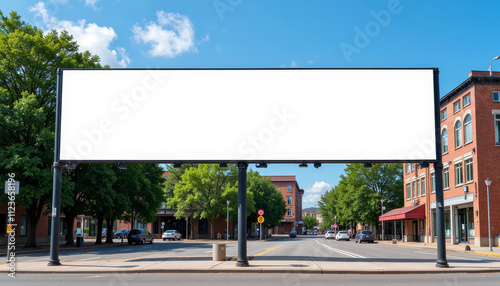 Blank billboard stands prominently on a sunny urban street lined with trees and charming brick buildings