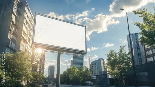 Blank billboard with a blue sky and clouds in the background with cars and buildings.
