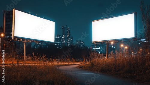 Blank Billboards Illuminate Night Cityscape: Advertising Space, Urban Night, Empty Panels Glowing Brightly at Dusk