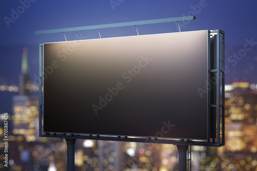 Blank black horizontal billboard on skyline background at evening, perspective view. Mock up, advertising concept