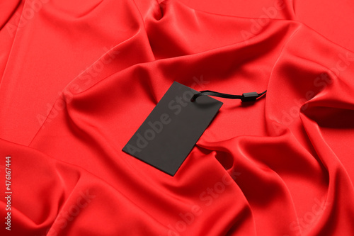 Blank black tag on red silky fabric. Space for text