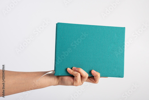 Blank blue book cover in hand on white background.