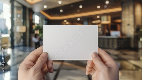 Blank business card mockup held by two fingers in front of a modern office lobby in dim,blank,business,empty