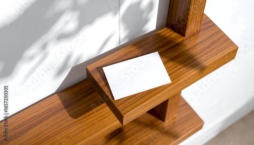 Blank business card rests on a wooden shelf against a white wall, creating a minimalist and professional scene with natural light, perfect for showcasing branding or contact information.