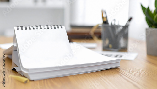 Blank calendar on a wooden desk, symbolizing organization and planning. Perfect for visualizing schedules, deadlines, or events. Minimalist, clean style.
