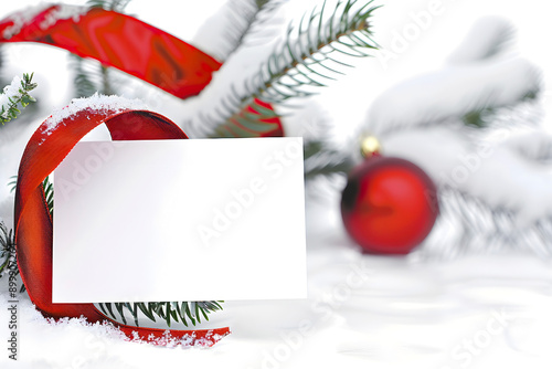 Blank card with red ribbon and Christmas decorations on snow-covered pine branches
