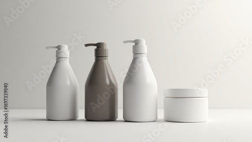 Blank cosmetic bottles and jar displayed against a plain background, showcasing various shades of neutral tones.