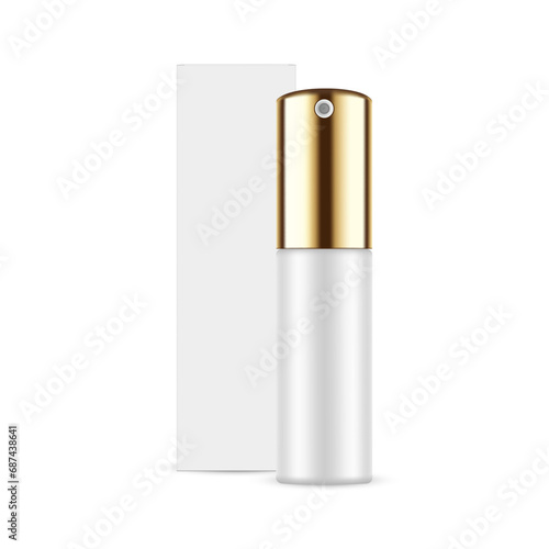 Blank Cosmetic Spray Bottle With Golden Cap, Paper Box, Front View, Vector Illustration