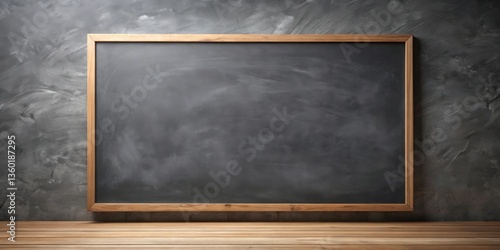 Blank dark slate chalkboard on rustic wooden surface against textured wall background ideal for message or announcement