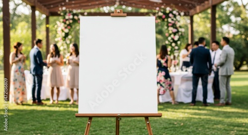 Blank easel in a garden setting with guests enjoying a party
