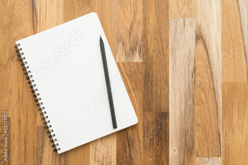 Blank empty notepad and pencil on wooden table background - Business and education concept.