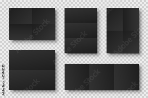 Blank folded paper sheets collection. Black notebook or book page. Design template or mockup. Vector illustration.