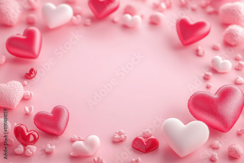 Blank frame and hearts pattern on pink background with Happy valentine day. Beautiful mini heart style. 3D rendering.