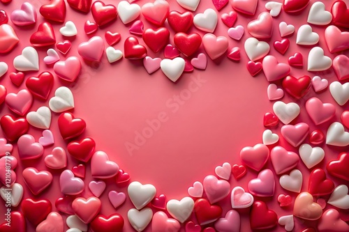 Blank frame and hearts pattern on pink background with Happy valentine day. Beautiful mini heart style. 3D rendering.