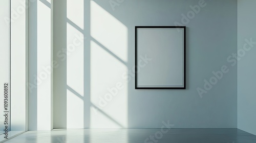 Blank frame on white wall, sunlit room.