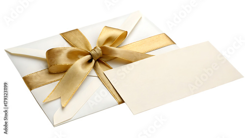 Blank gift card or invitation envelope with a gold ribbon cut out on PNG. AI GENERATED.