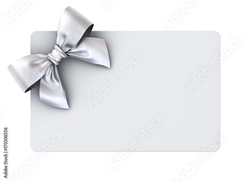 Blank gift card with silver ribbon bow isolated on white background . 3D rendering.