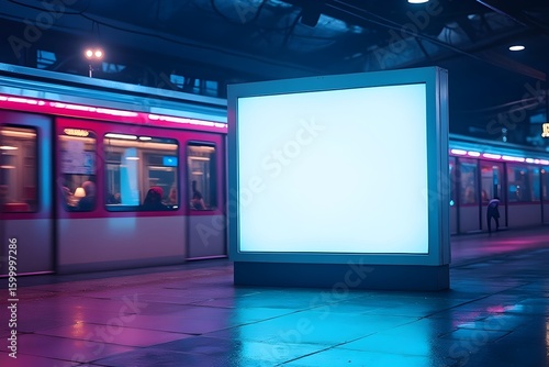 Blank glowing white advertising banner at night train station, vertical videotron mockup in blue and pink cinematic style with copy space