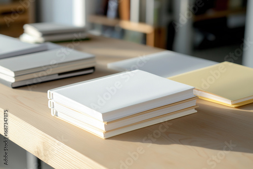 Blank hardcover books in neutral colors stacked on a wooden table in soft daylight