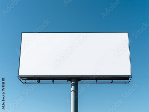 Blank horizontal billboard mockup against a clear blue sky. Low angle view of a large outdoor advertising sign.