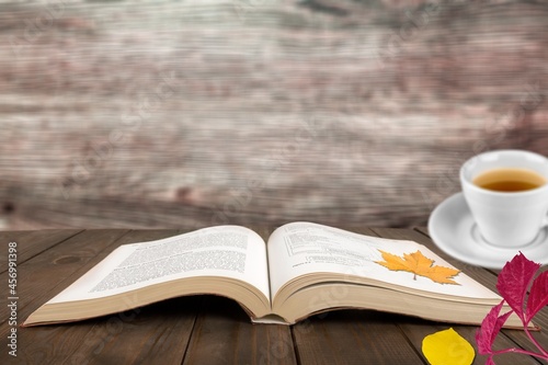 Blank journal on a rustic wooden table with a cup of tea, fall
