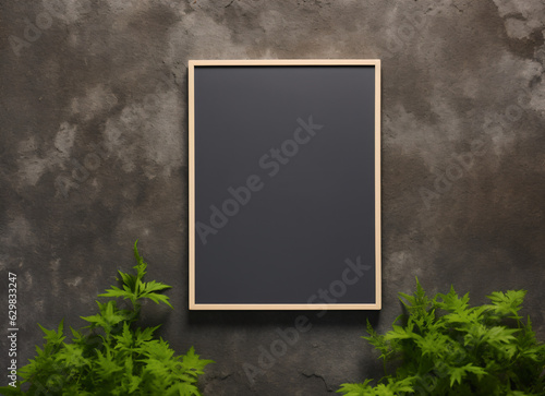 Blank mockup poster hanging against concrete wall surrounded by greenery. - Generative AI