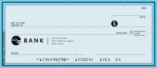 Blank money cheque. Bank check. Blue Check book template with pattern and empty fields. Currency payment coupon, US dollar check background.