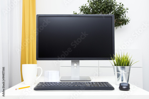 blank monitor and office accessories on table in bright interior