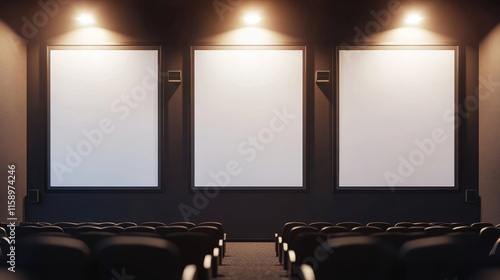 Blank movie posters illuminated by spotlights. Vector realistic mockup of white picture frames on gray tiled wall in cinema, theater or gallery. Empty advertising banners with black border and lamps