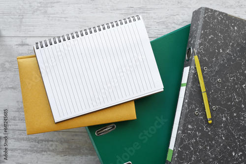 blank notebook, and a variety of stationery on a wooden table. green folder and yellow notepad.