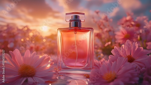 Blank perfume bottles arranged elegantly on a ceramic surface with fresh flowers