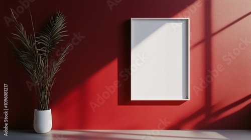 Blank photo frame mock up on red wall minimalist design with plant decoration. Concept of Art gallery or Exhibition