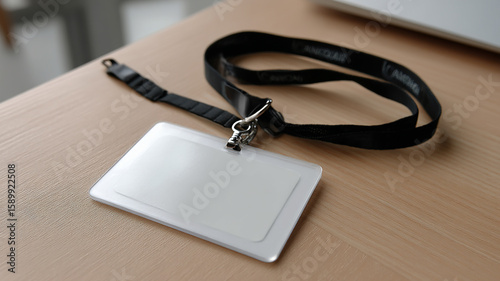 Blank Plastic ID Card Mockup with Lanyard on White Desk – Professional Identity Badge Display